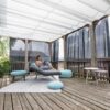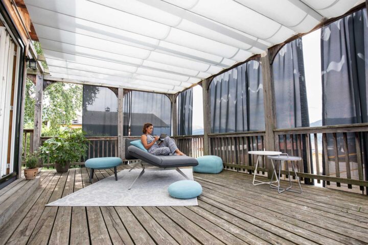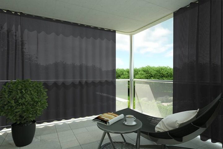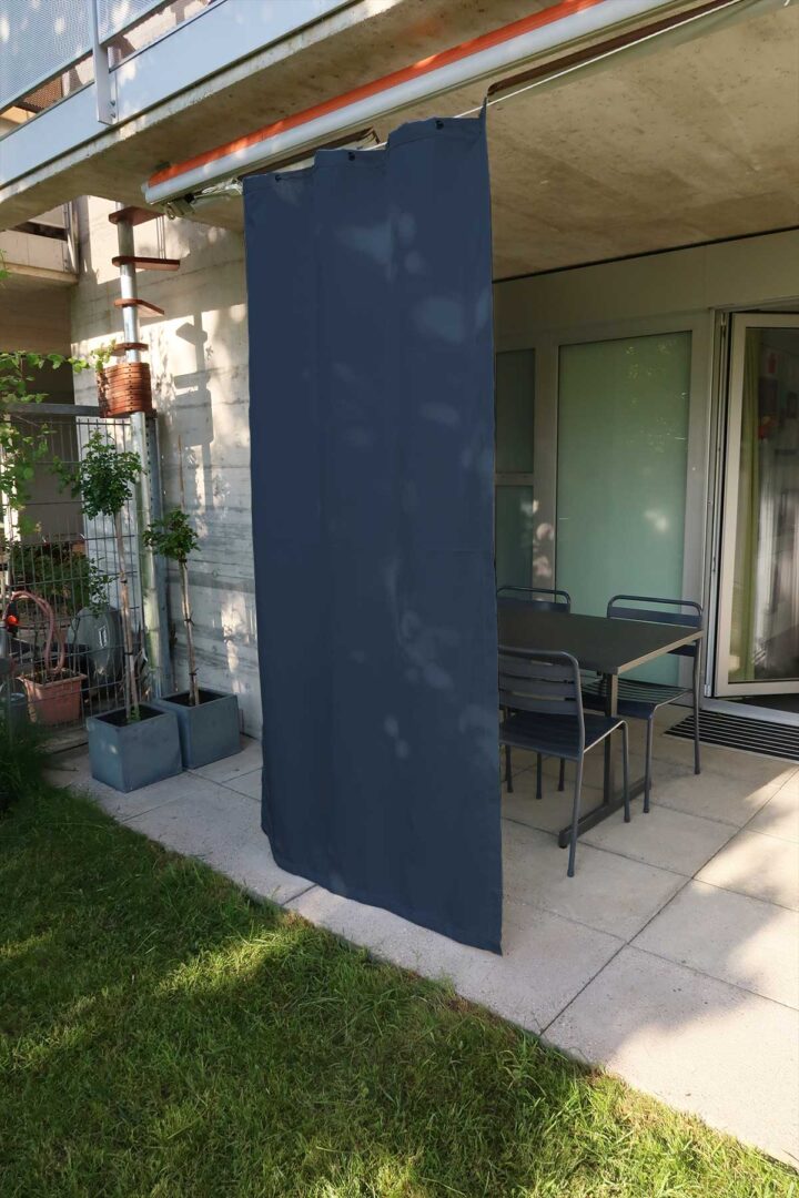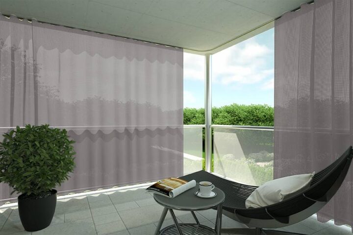 Der Outdoor-Vorhang ist schmutz- und wasserabweisend, wetterbeständig und flammhemmend.