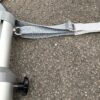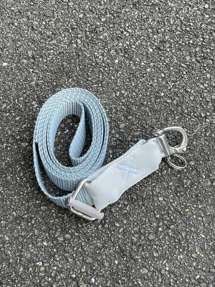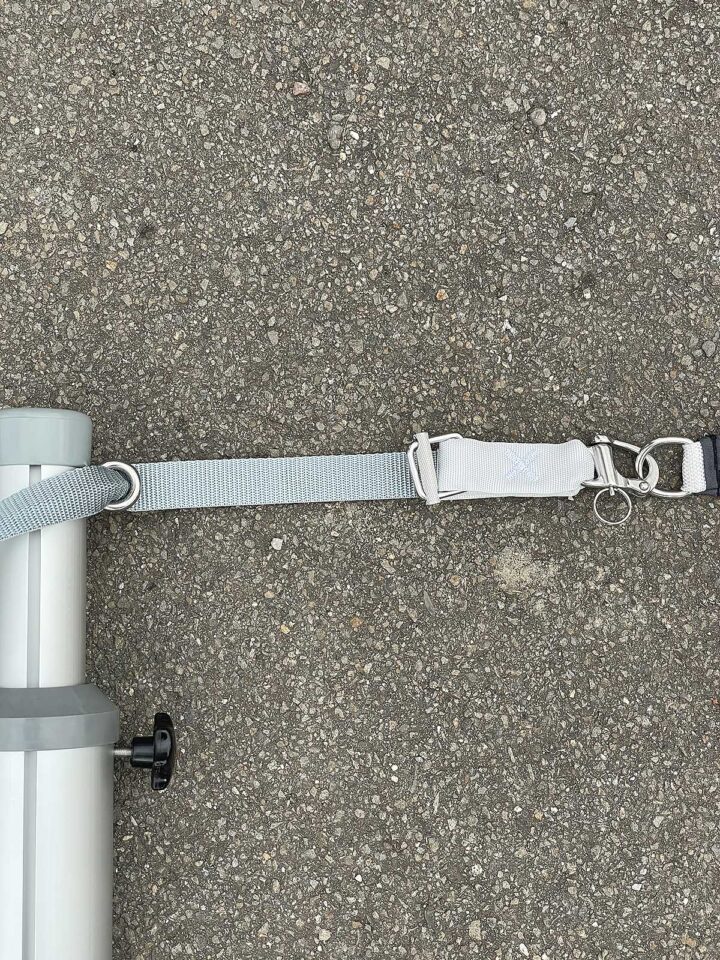 Der Spanngurt mit einer Gesamtlänge von 180cm besteht aus einem 25mm silbergrauen Polypropylen-Gurtband, einem rostfreien Schnappschäkel zur Befestigung am Sonnensegeleck und einer Gurtschnalle für die händische Spannung des Gurtbandes.