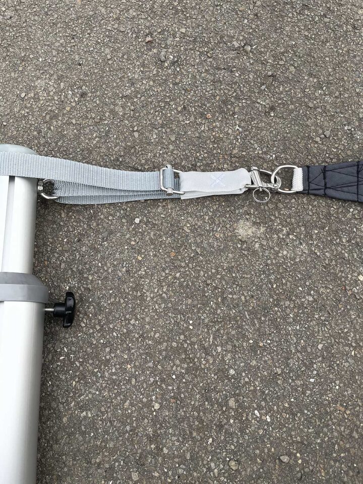 Zudem hat der Spanngurt eine Spann-Distanz zwischen rund 92cm und 15cm vom Sonnensegel-Eck zum Befestigungspunkt.