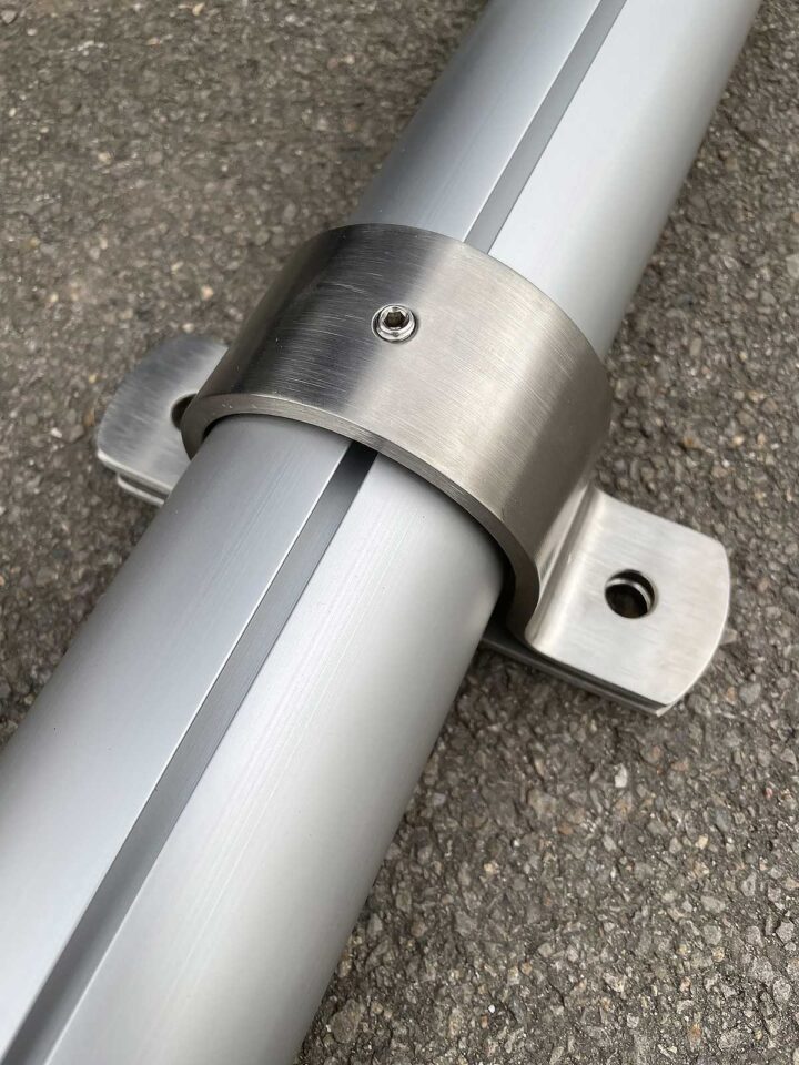 Zusätzlich sind die Schellen mit einer Bohrung inkl. Gewinde versehen. Damit kann der Mast zusätzlich gegen eine Verdrehung und Fall gesichert werden (Schrauben liegen jeder bestellten Wandschelle bei).